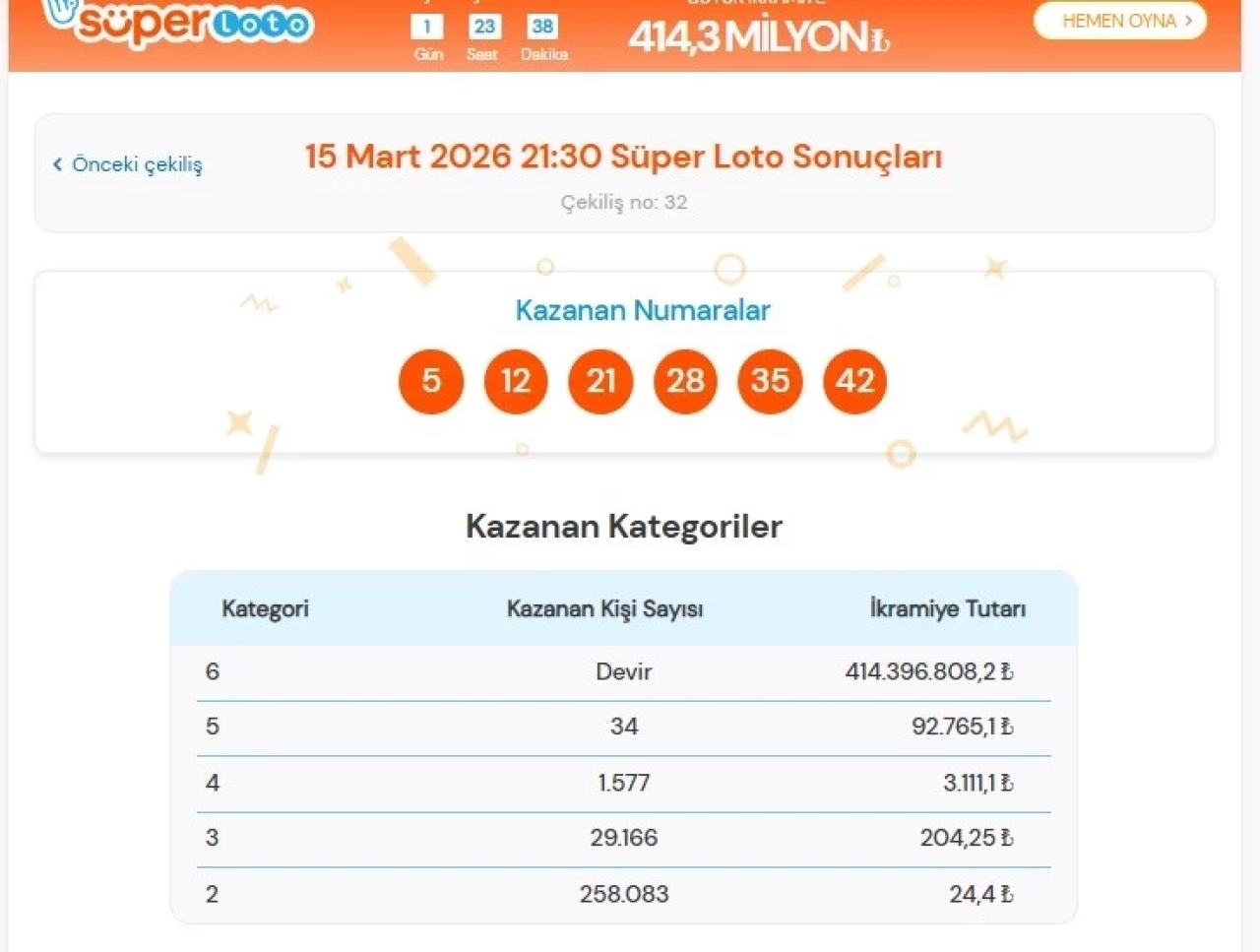 15 Mart 2026 Süper Loto Kazanan Numaralar