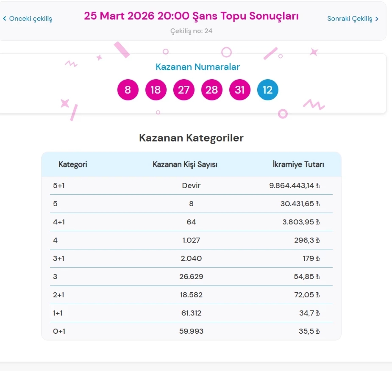 25 Mart 2026 Şans Topu çekilişinde 5+1 bilen çıkmadı, yaklaşık 9,8 milyon TL ikramiye bir sonraki haftaya devretti.
