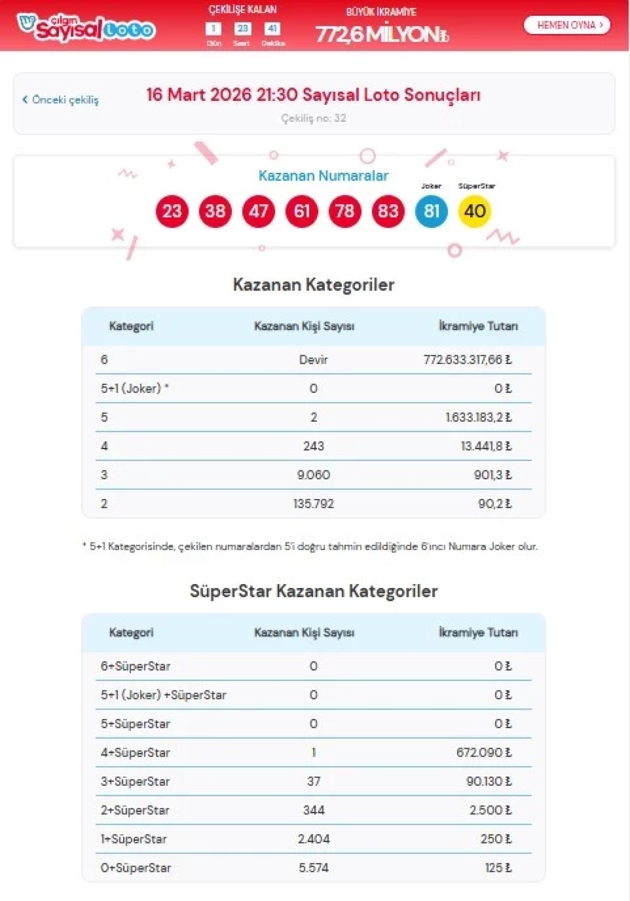 Bu haftaki çekilişte 769 milyon 979 bin 394 TL tutarındaki büyük ikramiye devretti. Böylece büyük ödül bir sonraki çekilişe aktarılmış oldu.