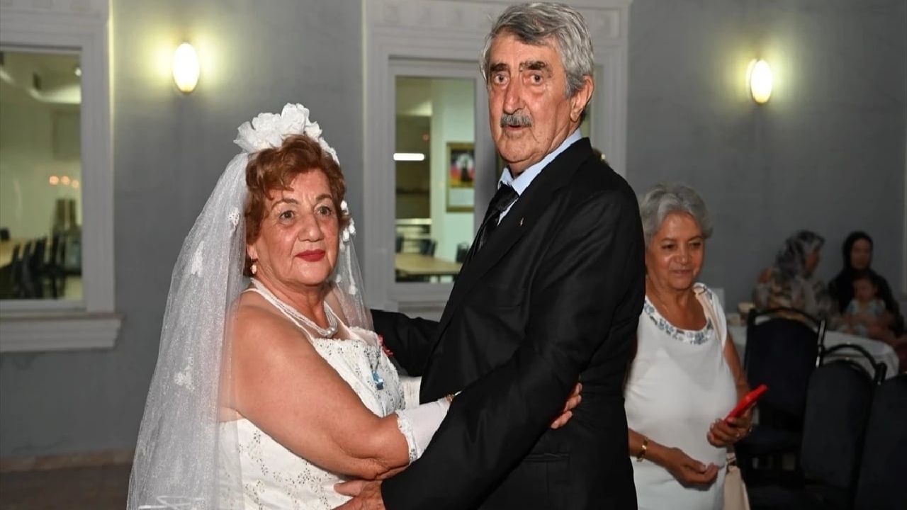 1968 yılında evlenen ancak maddi zorluklar nedeniyle düğün yapamayan Güllü (75) ve Mustafa Güneş (79) çifti, yıllar sonra hayallerine kavuştu. Hacı Bektaş Veli Anadolu Kültür Vakfı Kuşadası Cemevi'nde gerçekleştirilen düğün organizasyonunda çift, gelinlik ve damatlık giyerek temsili nikah töreniyle bir araya geldi.
